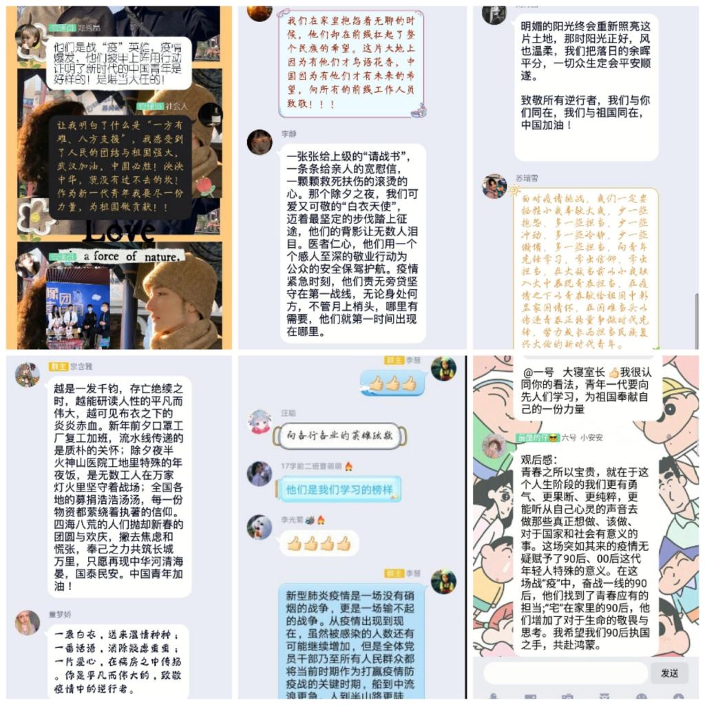 通过观看本次主题团课直播,同学们深刻认识到唯有奉献才能彰显青春的意义,唯有担当和责任才是青春的主题,唯有勇往直前才是青春的力量。在各班级群组讨论中,同学们热情高涨,讨论中进一步激发了大家的爱国热情和民族感情,同时也让同学们认识到,虽不能上前线,在生活和学习中,从我做起,以身作则,也是对抗疫的奉献。作为一名青年团员,就要在抗疫中彰显无私无畏、勇于奉献的精神!(供稿人:王松洁)