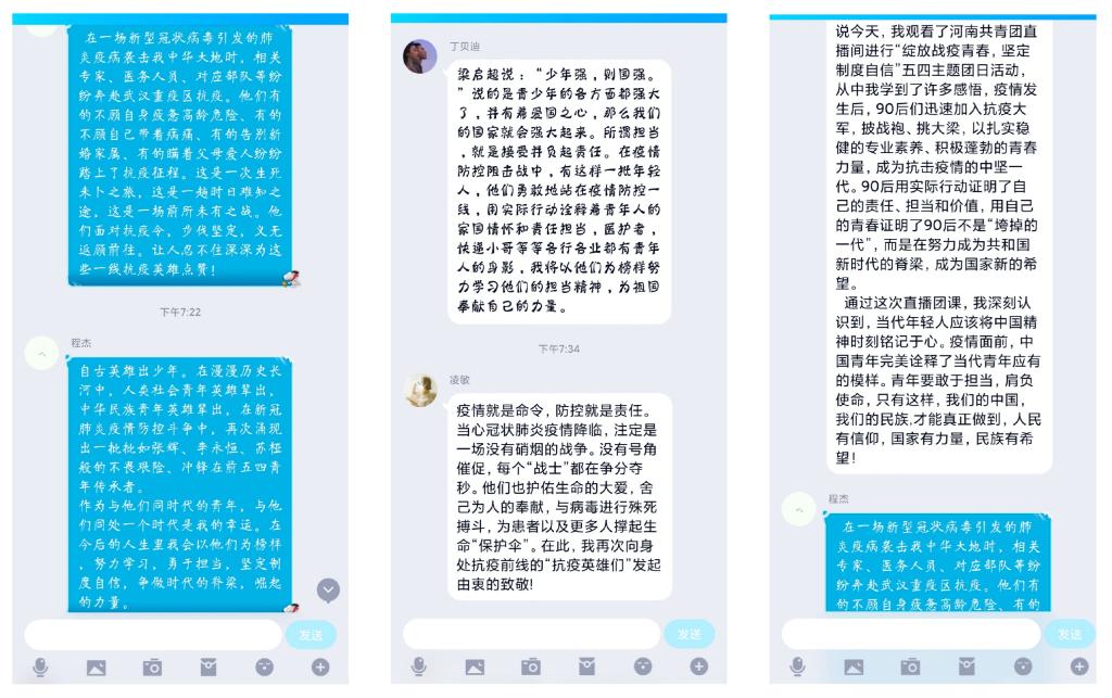 18汉本一班班长胡淳浩表示:“青年人永远是一个国家的未来,毛主席曾经说过‘这个世界是我们的,但归根结底是你们的,你们就像是早上八九点的太阳,充满希望。’在这一次疫情大考中我们可以看到,我们的年轻人是最棒的。在这次前所未有的困难中,无论在何处、是什么职业,青年人坚持党的领导、响应党的号召,不怕苦不怕累为国家、社会、民族作出贡献!他们有疫情期间坚守岗位的快递小哥,有奔赴一线的医护人员,有为基层防疫作出贡献的老员工,他们化为一颗又一颗的螺丝钉,在党的领导下,共同努力来让社会机器没有停摆。我们可以骄傲地说:我们的青年不落于人,我们的政党不差于人,我们的道路不让于人!”