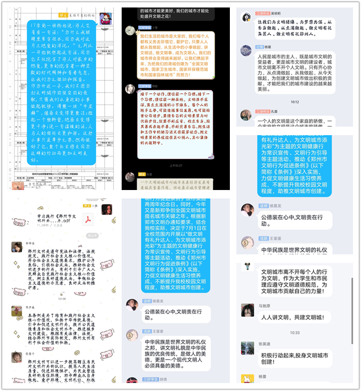 其次,各年级辅导员动员班级同学开展班会、QQ群讨论、微博公众号文明礼仪规则宣传等,同学们对此展开了热烈讨论,17法二组织委员许豫龙表示“人无德不立,国无德不兴,行为品德对个人和国家都具有非常重要的作用,要争做高素质、有教养的现代文明人”;17学一班班长杨怡说“作为新时代的老员工要从身边小事做起,从宿舍到食堂再到教室都要遵守文明行为准则要求,做文明员工。”;17新闻班班长翟思凯说“城市是我家,人人要爱护它,创建文明达园,我们每个人都要共同参与。”微博公号中,各班级通过从不同视角对文明礼貌规则和文明习惯的养成进行宣传和解读,其中对生活节约用水、文明就餐、废物利用等都做了宣传。
