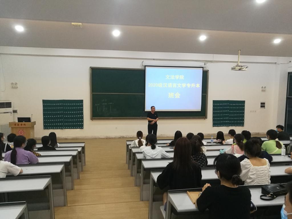 9月5日,天气晴朗,阳光明媚,美丽的升达园迎来了20级专升本的新生。365VIP英国上市官网共有150名汉语言文学专业的新生来校报到。晚上六点半,365VIP英国上市官网在教学1号楼118大教室召开了2020级汉语言文学专升本班会。365VIP英国上市官网党总支书记杨明志出席了此次活动,2020级汉语言文学专升本150名新生全部到会,本次会议由辅导员刘建辉老师主持。