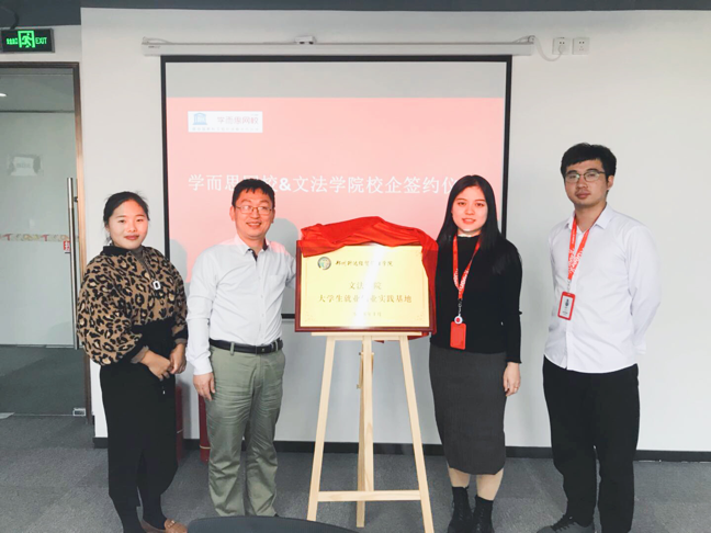 在参观了工作环境和条件之后,双方就员工实习实践、职业规划、教学改革等方面开展讨论,并达成一致意见,段丰乐经理与曾慧敏老师签署校企合同协议书,并对实践基地揭牌,最后,与会人员合影留念。