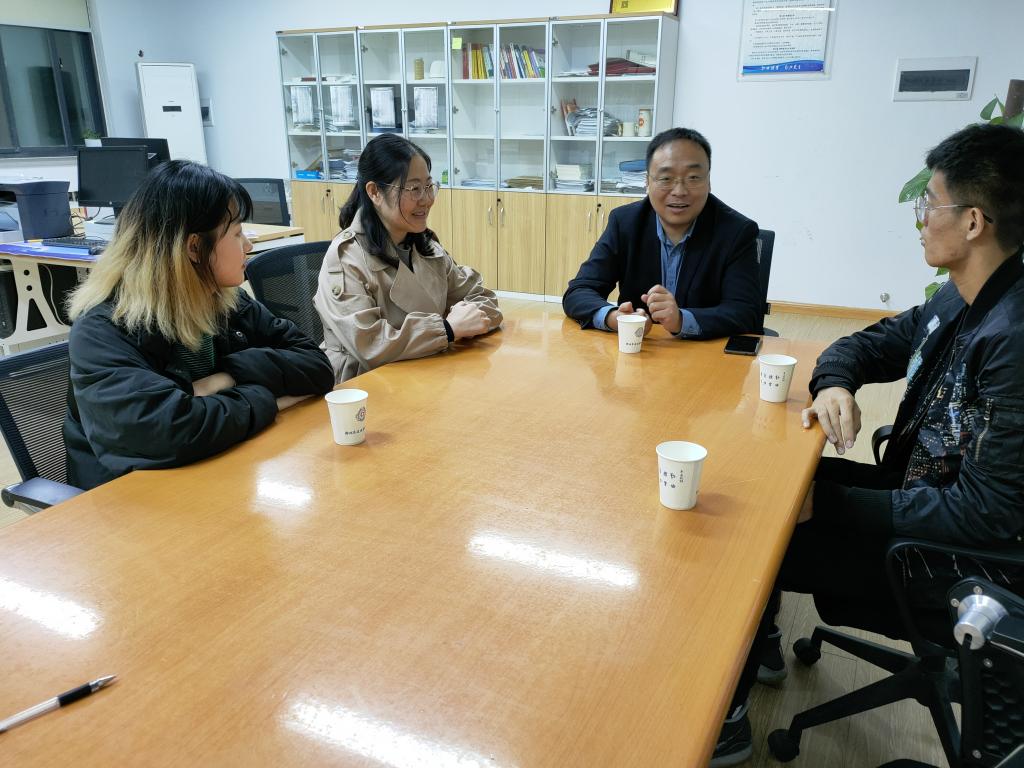 2020年10月14日于教学一号楼116办公室,河南省鹤壁市淇滨区人民法院周勇瑞法官与公司校内法学专业教师徐静老师及其在“双导师”制下负责的2019级法学二班的三位员工进行见面会。