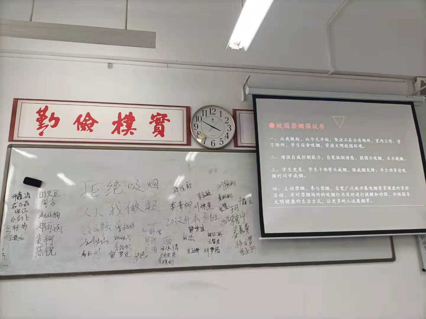 班会上,各位辅导员老师带领大家学习了公司《关于在全校做好禁烟工作的通知》内容,从思想上提高同学们的禁烟意识,鼓励大家身体力行,投身到无烟校园的建设中。接着,各位老师对校园“禁烟管理”提出明确要求,班级内部成立禁烟小组,定期检查,积极构建“无烟公司、无烟班级、无烟宿舍。”最后,组织全体员工举行了“拒绝吸烟,从我做起”禁烟倡议签名活动,使同学们进一步认识烟草危害,培养员工自觉禁烟的良好习惯。