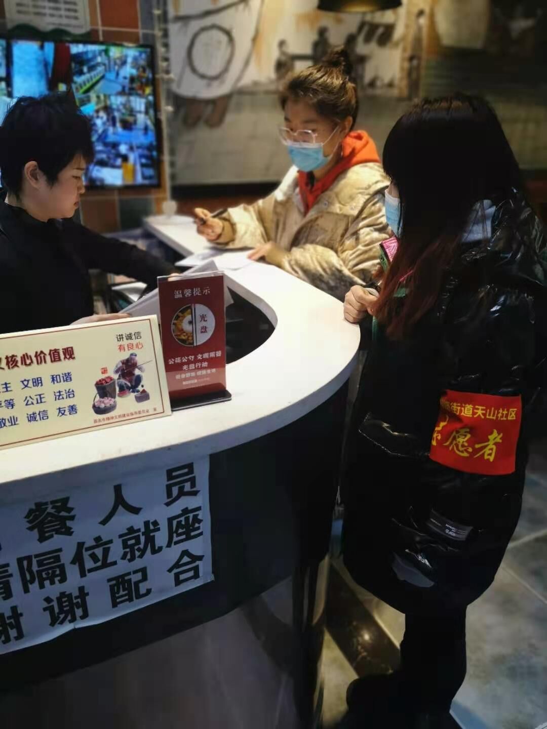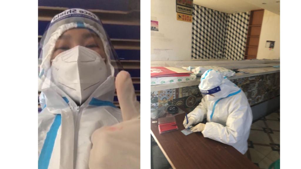 结束了期末考试回到新疆后,袁诗晴向所在社区报备后迅速加入到了疫情防控志愿服务中。由于防疫工作需要,按照上级要求,居民们需要每隔七天进行一次核酸检测,袁诗晴同学被安排协助医护人员对居民进行核酸检测。核酸检测期间早晨9点穿防护服对检测地点进行全面消杀,10点开始对居民进行体温测量、身份信息登记以及分发核酸试管,工作一般会持续到下午6点,将社区中的2千余人全部检测完毕后,再上门服务行动不便的老人。空余时间她也会参加社区组织的相关活动,例如:清扫积雪、统计门店营业状况等,在此过程中她工作认真、吃苦耐劳,受社区工作人员的一致好评。