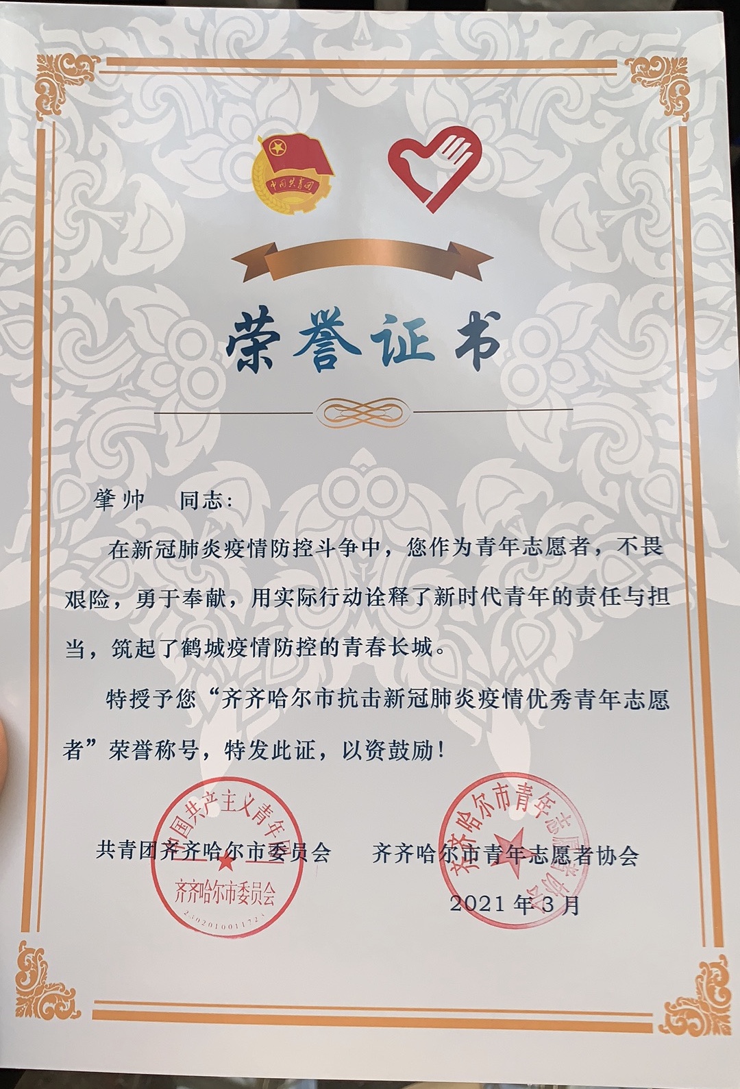 在当地刚刚结束的志愿者评选中,肇帅同学获得“齐齐哈尔市抗击新冠肺炎疫情优秀青年志愿者”荣誉称号,她说:“时有所需,必有所为,国有所需,我必前行。通过这次的志愿服务实践,我深刻认识到作为青年一代,应用行动肩负起时代赋予的责任,用责任点燃最美好的青春”。(供稿人:杨玉兰、肇帅)