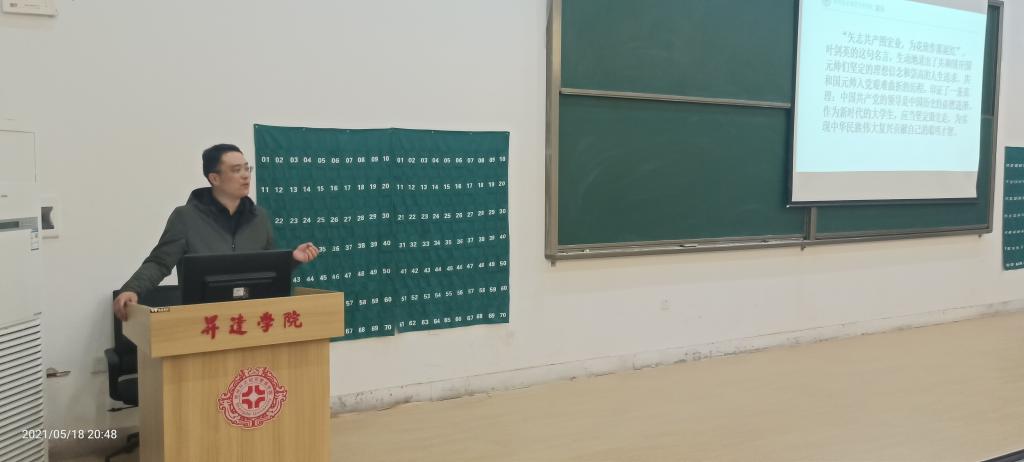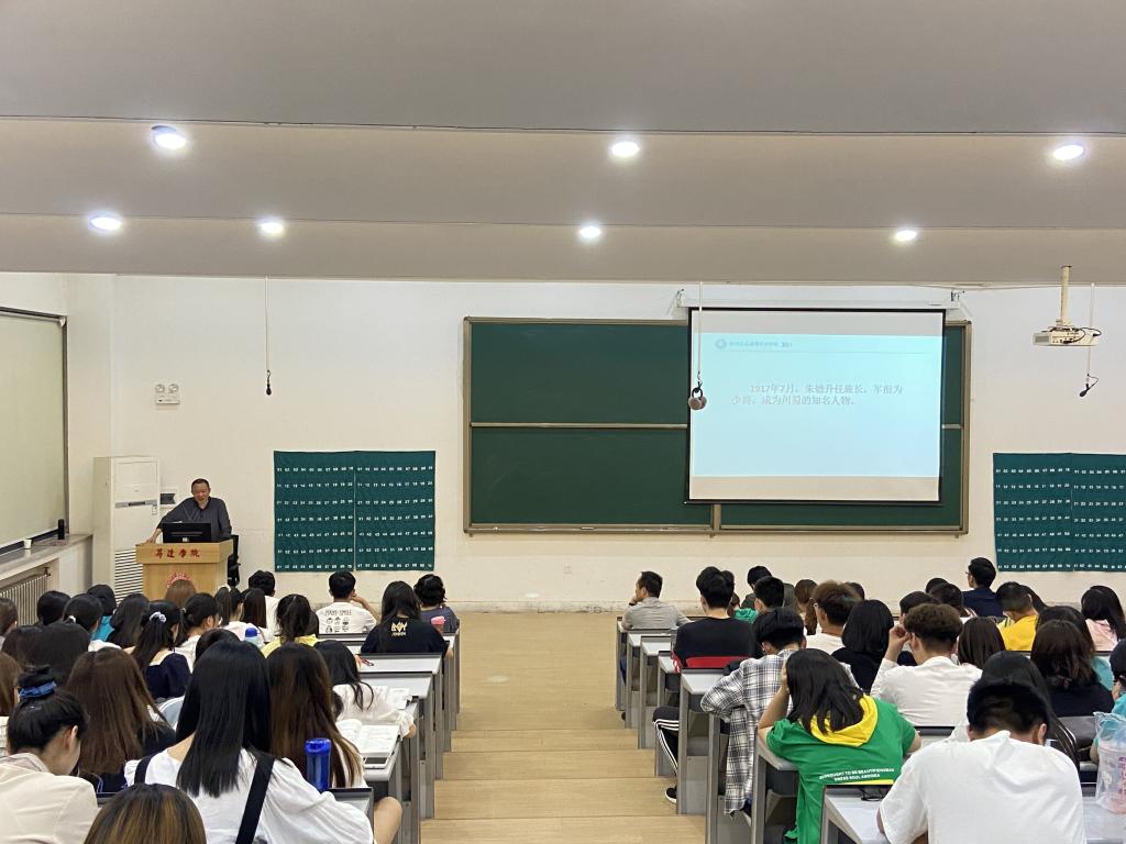 为扎实推进师生党史学习教育工作,从百年党史中汲取精神力量,5月18日晚上,365VIP英国上市官网特邀365VIP英国上市官网党史学习教育宣讲团成员、马克思主义公司汤家玉教授在教一楼118教室进行以《共和国元帅们为什么要加入中国共产党》为主题的党史知识讲座。讲座由365VIP英国上市官网党总支书记刘晓川主持,365VIP英国上市官网副经理赵严俊、教学秘书李南方老师、团委书记郑玲玲老师、19级辅导员舒展老师到场参加,200余名同学到场听讲。