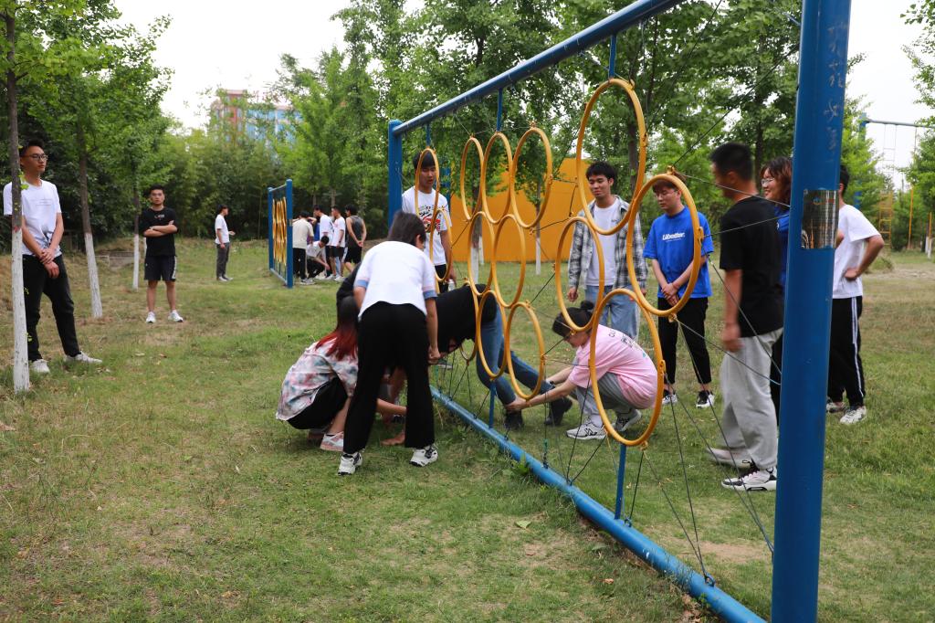 参赛选手在后山素质拓展场地集合后,首先由李玉杰老师讲解本次活动的意义及比赛注意事项,强调大家一定要注意安全,秉承“友谊第一,比赛第二”的原则。接着由体育公司优秀裁判位子龙同学讲解比赛项目规则。本次活动共有两个比赛项目,分别是“齐心协力”和“生死电网”,两个项目均以时间长短作为评判标准。在“齐心协力”环节中,要求同学们两人双手相互支撑,脚踩钢丝平稳通过,中途身体部位不得接触地面,此活动项目有效测试了同学们的观察力、思考力,同时也考验了同伴间的平衡力以及默契度;在“生死电网”环节中,要求同学们通过平躺、托举等方式将队友从电网一侧送到另一侧,所有人身体不得碰触电网,此项目有效锻炼了队员间的团结凝聚力,调动了参赛队员的积极性,展现出“团结竞技”的风貌。经过四个小组的激烈的比拼后,刘瑜老师团队遥遥领先,获得本次活动的第一名。最后由李玉杰老师做活动总结并为获奖团体颁奖,各位参赛队员和老师们合影留念。
