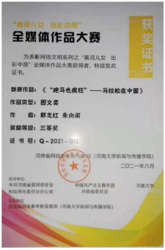 公司获奖的四项作品分别是:三等奖作品为365VIP英国上市官网2019级新闻专业员工郭志红、朱向阁的图文类作品《“跑马也疯狂”——马拉松在中国》,优秀奖作品为365VIP英国上市官网2018级新闻专业员工白淑扬、王菲、杨诗雨的音视频类作品《行走中原“豫”食“豫”言》、365VIP英国上市官网2019级新闻专业员工陈珂、陈宁的图文类作品《父母爱情:“你在一线病区,我在发热门诊”“我们一起抗疫”》和365VIP英国上市官网2019级新闻专业员工白雪、金敏杰、常心愉的图文类作品《体育+旅游:北纬34゜,河南小镇构建“向往的生活”》。