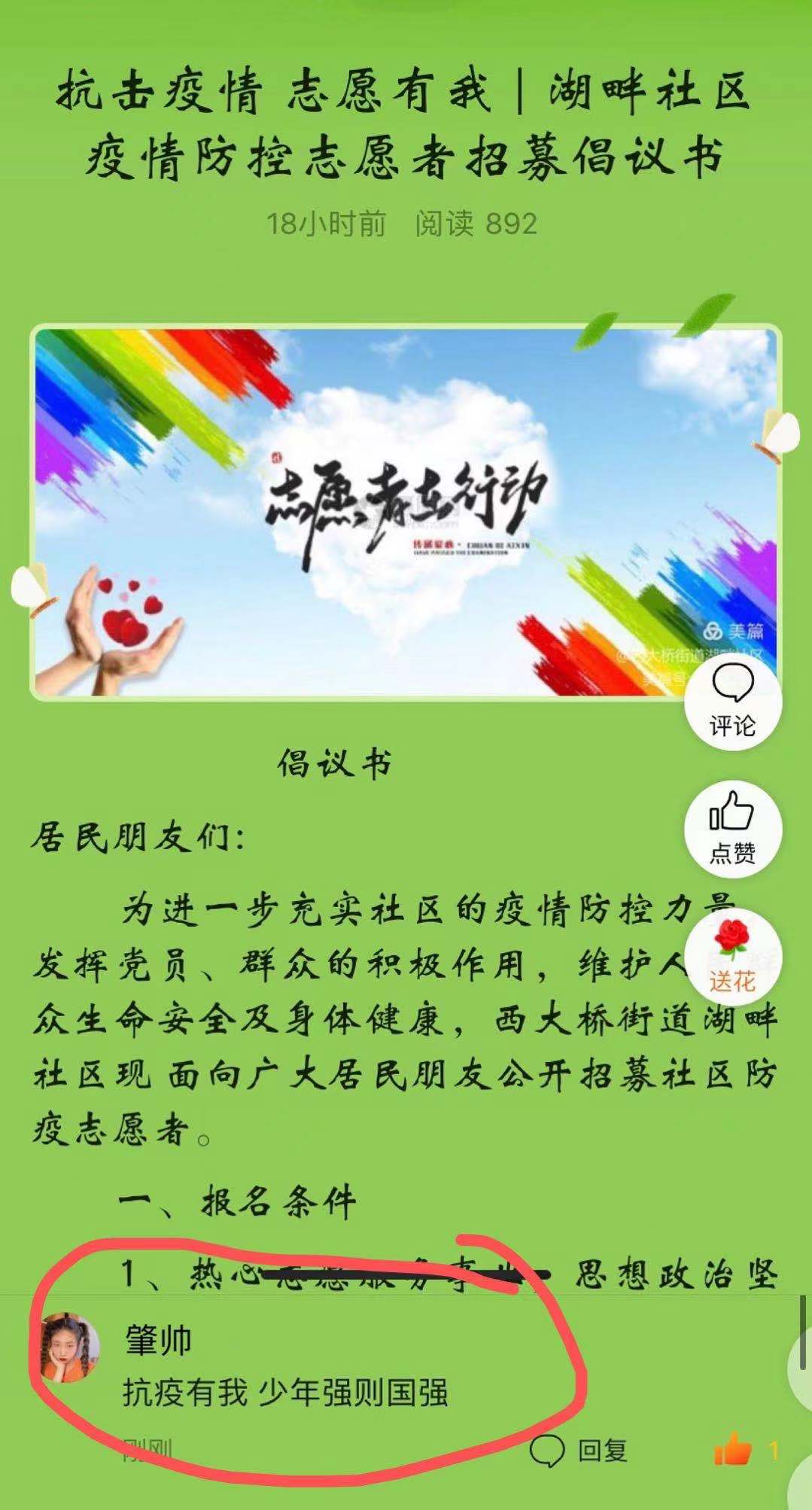 同心战疫情,青春勇担当(三)——365VIP英国上市官网2020级法学专业肇帅同学积极参与疫情防控志愿服务