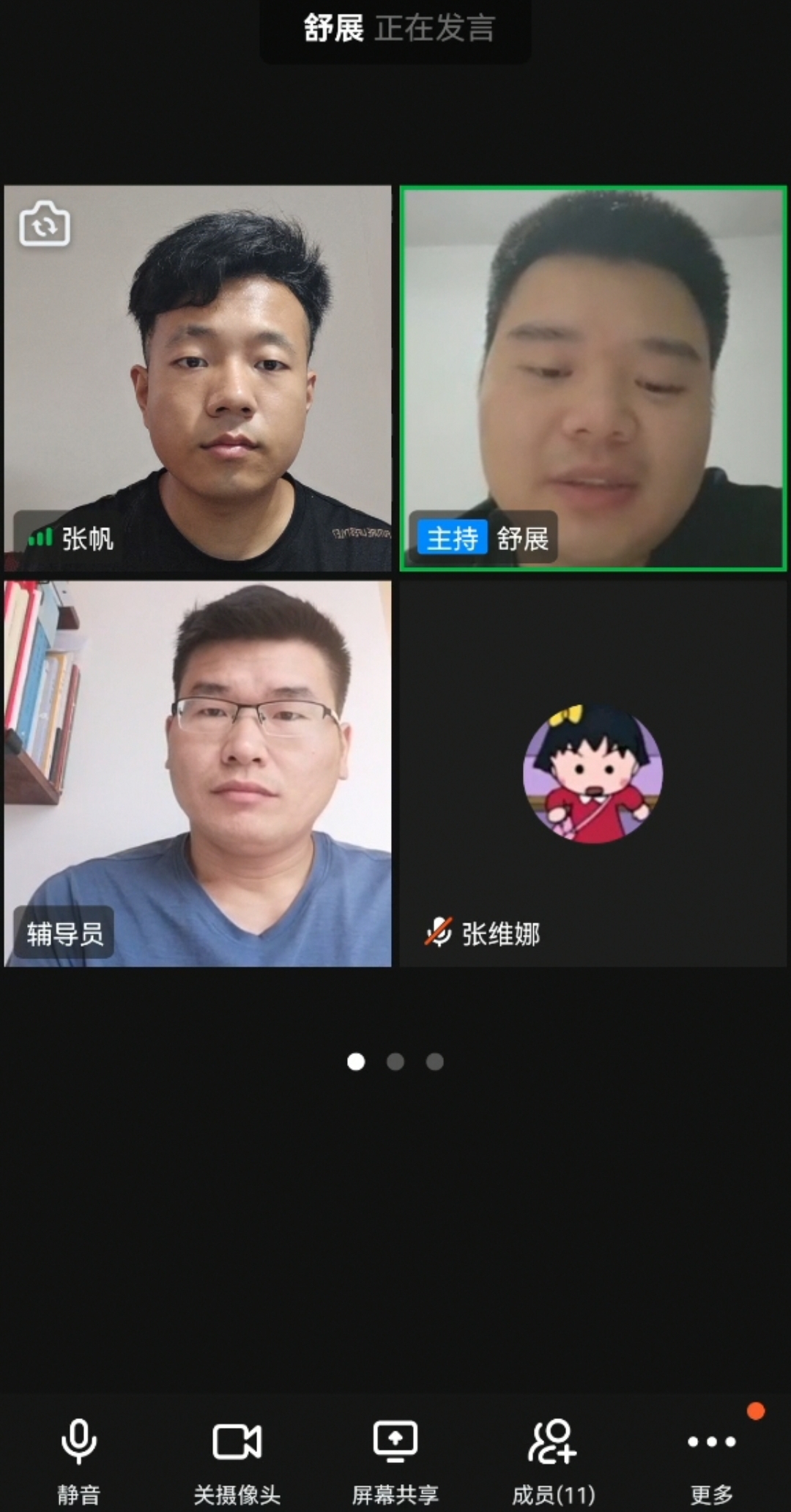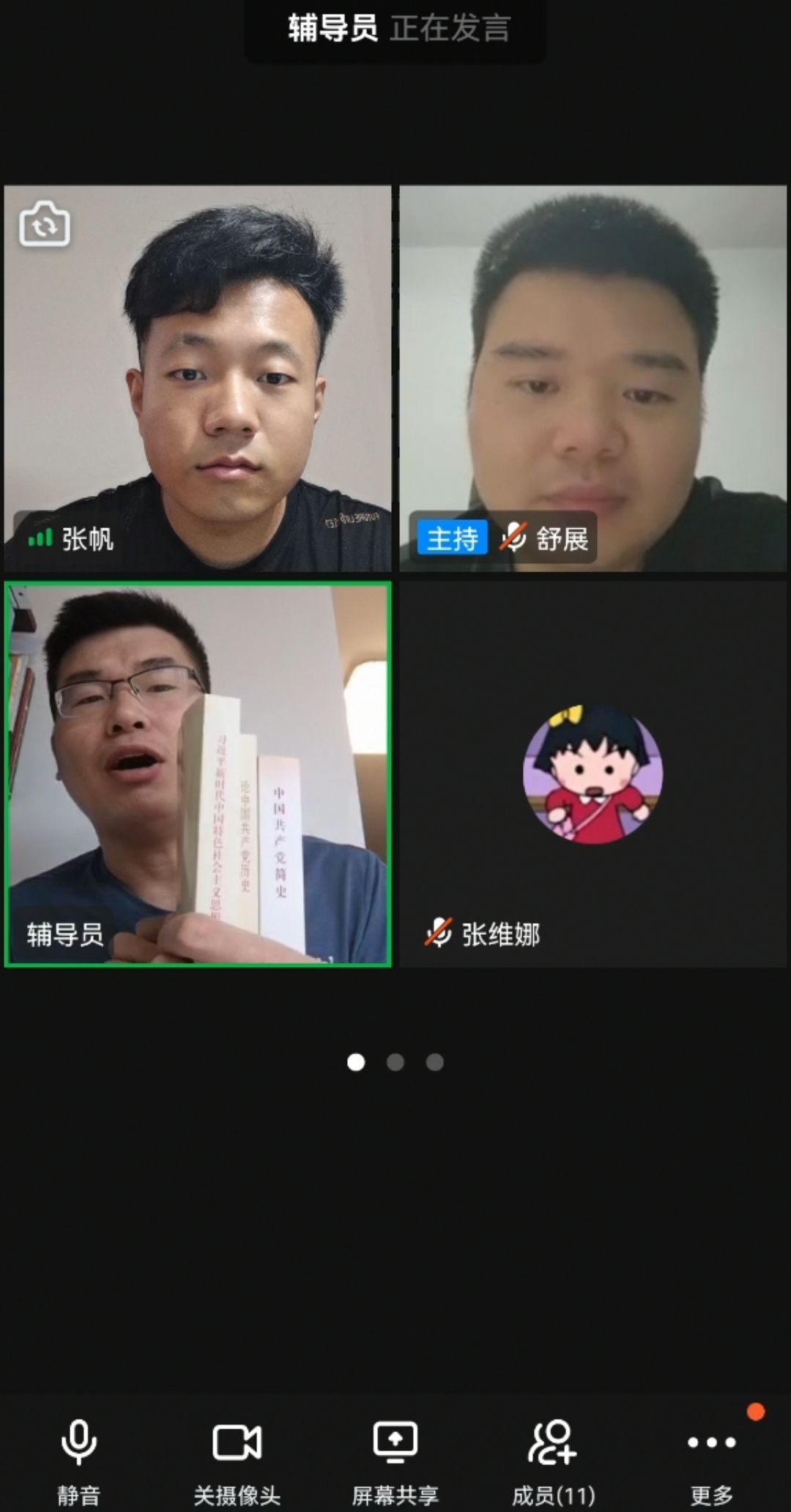 会议伊始,支部组织委员舒展老师带领大家回顾了习近平总书记对29位“七一勋章”获得者的评价,随后舒展老师向大家分享了出生在高光家庭但勤俭朴素的李宏塔同志的事迹。他不仅是当党员领导干部忠诚担当的典范,又是共产党人革命传统、优良家风的传承人。李宏塔用实际行动传承祖父以严治家、“守常”的清俭家风,秉承了祖父李大钊的党员本色。舒展老师号召大家作为青年党员,要做到关键时刻站的出来、危难关头豁得出去,奉献自己的绵薄之力。紧接着张帆和白淑杨做感悟发言,他们都表示授予29位党员“七一勋章”,是对全体党员的巨大激励,在全党全社会形成了崇尚先进、见贤思齐的浓厚氛围,特别是在疫情特殊时期,作为青年党员更要牢记党的初心使命,为党和人民奉献自己的力量。