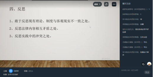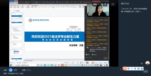 法学教研室另一位骨干教师王斐副教授根据就业导向,为新生介绍法学专业的双导师制、专职班主任制度、专业实习基地、四年的学习规划和任务目标。为了帮助同学们解疑答惑,在每位老师汇报结束后,还设置了师生互动环节,在一种温馨积极地气氛中有序进行。由主讲老师解答同学们的问题,同学们积极向老师提问,直播现场气氛热烈,老师们认真回答了每一个问题。