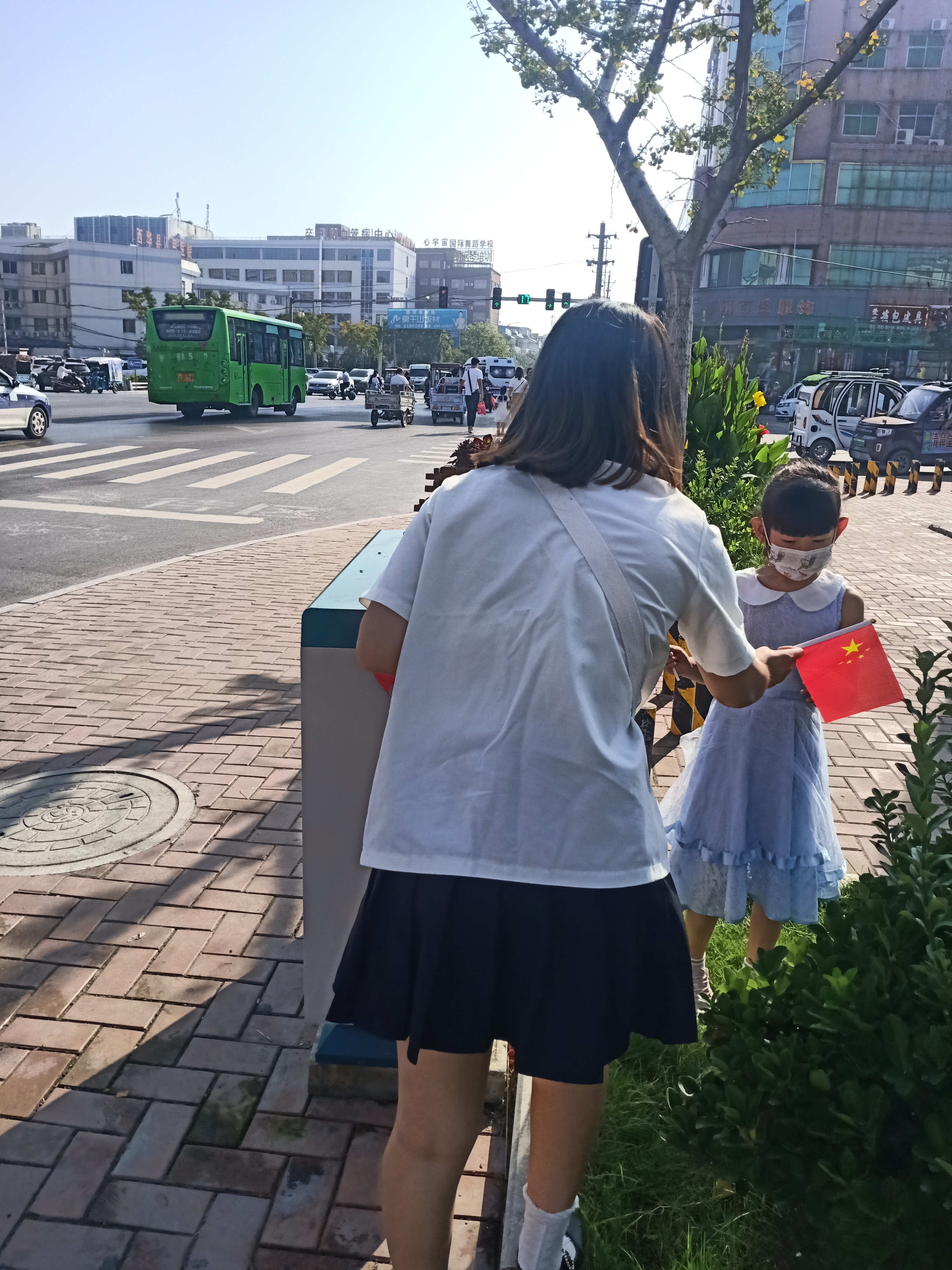 李新宵同学与同伴用勤工俭学攒下的钱提前购买了一千多面手持小国旗于10月1日当天一大早走上街头,免费为路人分发。“你好,大家一起为祖国庆生!”“你好,今天是祖国母亲72岁的生日。”一位在附近上班的职员骑车经过,高兴地接过国旗认真地别在车前;一对母子经过,接过李新宵手中递过来的国旗,妈妈对小男孩说:“这是五星红旗,是我们国家的象征,要好好保护它哦!”。很快,整条街道到处都能见到拿着小国旗的行人,到处洋溢着喜庆的氛围。