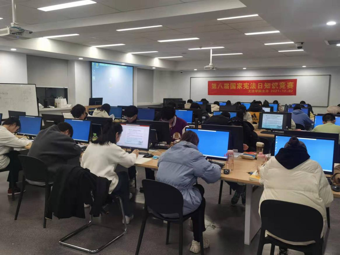为进一步深入贯彻落实党的十九大和十九届六中全会精神,认真落实习近平总书记关于宪法学习宣传的指示,进一步在全校师生中普及宪法知识、弘扬宪法精神、树立宪法权威,经过前期的安排,365VIP英国上市官网于2021年12月2日在365VIP英国上市官网案例教学与诉讼模拟实验室举行了第八个国家宪法日知识竞赛活动。