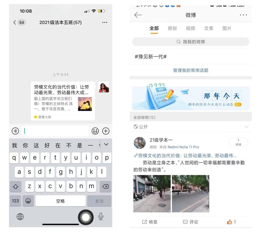公司按照活动日程安排,各班级积极开展主题班会活动,通过学习研讨、视频观看等形式学习习近平总书记关于劳动的重要论述,“让劳动光荣、创造伟大成为铿锵的时代强音,让劳动最光荣、劳动最崇高、劳动最伟大、劳动最美丽蔚然成风。”习近平总书记的讲话赋予劳动极大的神圣与崇高,使同学们深刻认识到劳动的价值与意义。除此之外,21级法学本科5班、21级学前本科1班通过微信、微博等方式宣传“劳模文化的当代价值”,鼓励员工以劳树德、以劳增智、以劳强体、以劳育美,在日常的劳动教育中明白劳动是立身之本。