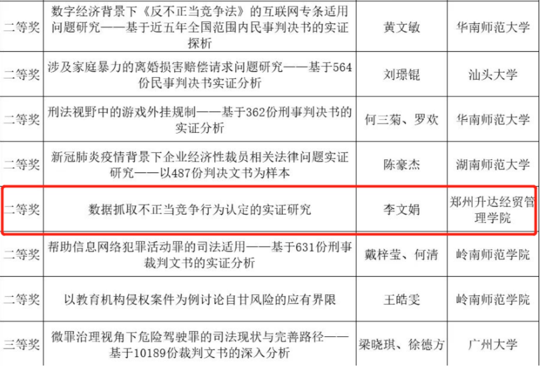 由广东省法学会主办,广东省法学会信息通信法学研究会、华南师范大学法公司、华南师范大学人工智能法律应用研究中心承办的第二届“小包公杯”粤港澳老员工法律实证分析征文比赛活动,经公司统一安排,法学教研室组织,共有20名法学本科员工报名参加。由段丰乐经理指导的2019级法学本科1班李文娟同学荣获本次征文比赛二等奖。