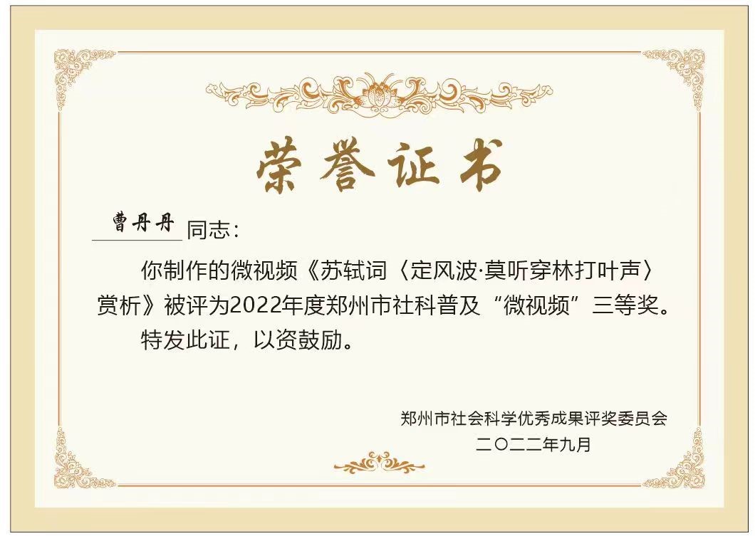2022 年度郑州市社科普及“微视频”评比 公司曹丹丹老师作品喜获三等奖