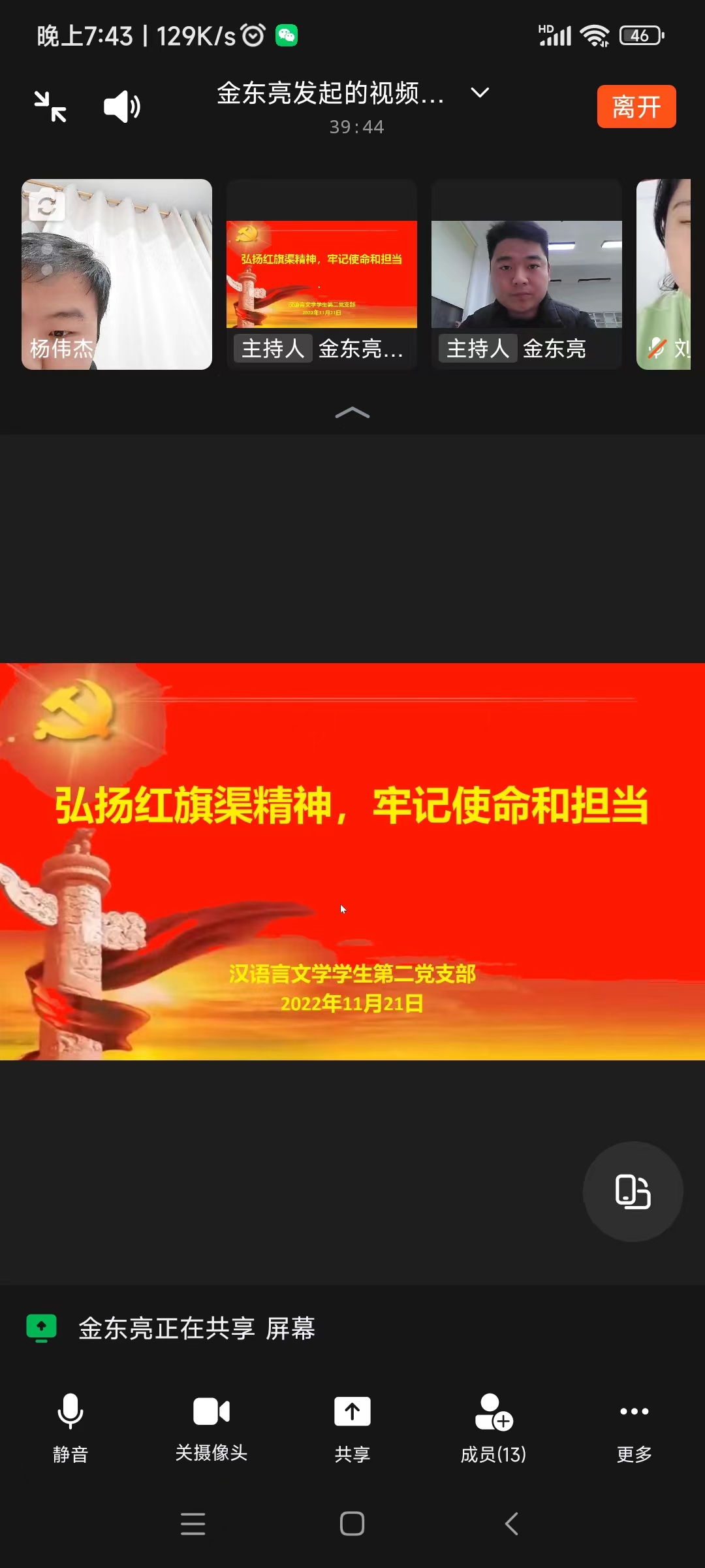 为深入学习贯彻党的二十大精神和习近平总书记视察河南安阳时的重要讲话精神,11月21日晚,汉语言文学专业员工第二党支部以“深入学习习近平总书记视察安阳重要讲话精神,大力弘扬红旗渠精神”为主题召开了专题组织生活会,会议由党支部书记金东亮主持,支部全体同志参加。