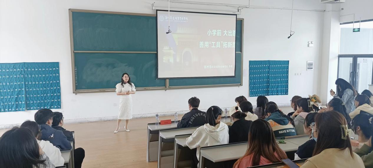 2022年3月30日下午2点,郑州女企业家协会李倩秘书长在教学1号楼118教室做题为“小学前,大出路,善用‘工具’拓新路”的讲座,段丰乐经理主持,学前教育专业教师代表和员工参加。