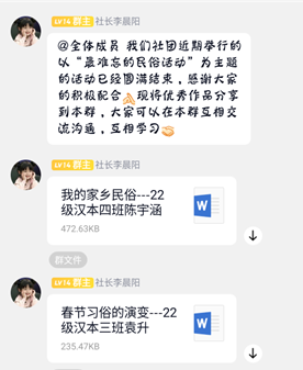 前期收集参赛人员稿件并进行社内筛选和整理,评出优秀稿件。在比赛中,春苗社向同学们展示优秀作品并进行交流学习,在比赛过程中,同学们不仅学习了不同的民俗文化,还进一步了解民俗文化的内涵,同时也推动了民俗文化的传播,大家畅所欲言,对民俗文化进行了深入的讨论。比赛结束后,李晨阳希望大家保持在比赛中的热情,为民俗文化的继承和传播贡献力量。