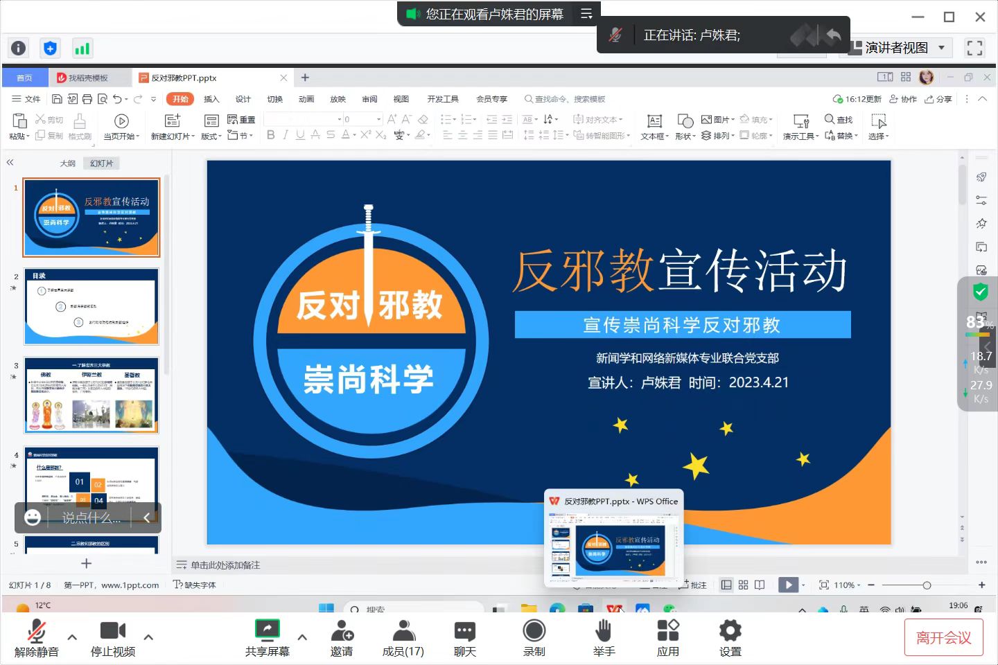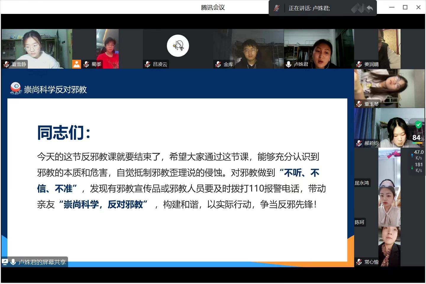 为增强支部党员国家安全意识,深化反邪教斗争,4月21日,新闻学和网络与新媒体专业员工党支部召开线上反邪教宣传活动,会议由党支部书记吕凌云主持,党支部全体同志参加。