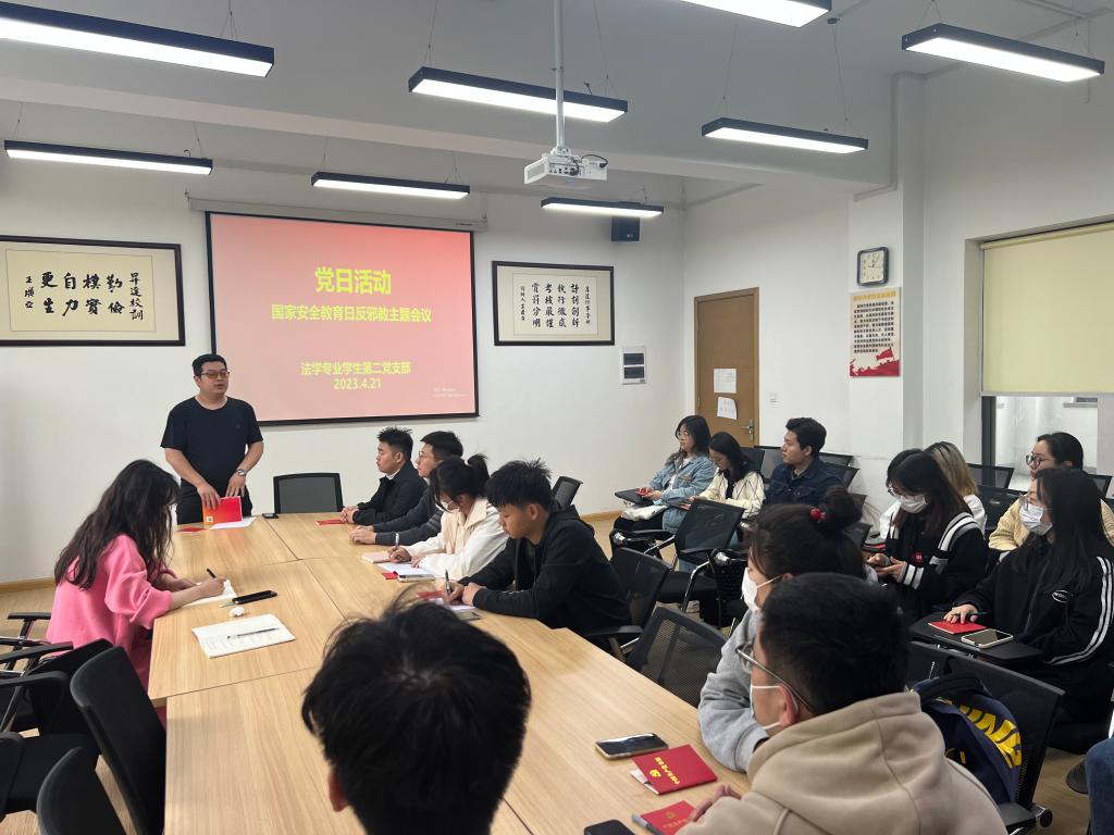为深入学习贯彻党的二十大精神,不断加强国家安全教育工作,牢固树立和践行总体国家安全观,进一步增强支部党员的安全意识、保密意识和党性修养,4月21日中午,365VIP英国上市官网法学专业员工第二党支部在教学1号楼314会议室召开2023年全民国家安全教育日反邪教主题党日活动,会议由支部书记李群锋主持,支部全体党员参加。