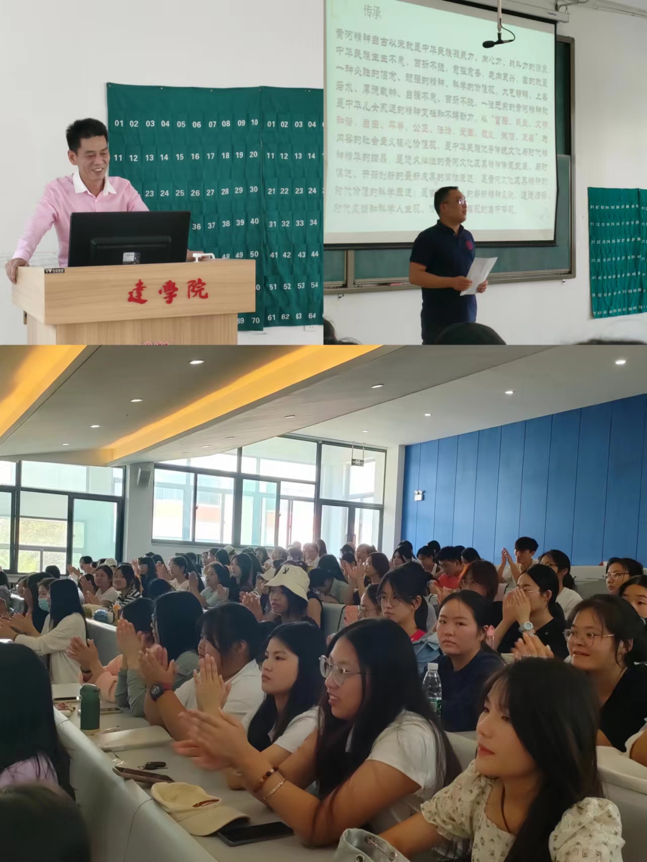 程教授用李白的《将进酒》作为开篇,以“天生我材必有用,千金散尽还复来”两句诗勉励大家。黄河流域是中华民族的摇篮,是中华文明的发祥地,程教授以诞生在黄河流域的诗词为主线,深刻阐释了生生不息的黄河精神,从源起到奔流再到传承,黄河精神随着历史的发展不断凝练,焕发新的生命力,引领着一代又一代的中华儿女与时俱进,在新时代焕发出勃勃生机。