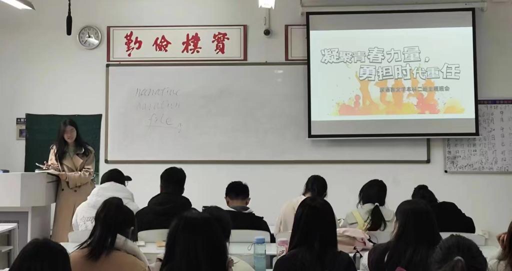 为深入学习贯彻党的二十大精神,勇担时代重任。11月12日上午10点,2023级汉语言文学本科2班团支部“唱响青春赞歌,勇担时代重任”主题团日活动在道镕楼322教室举办,团支书智静怡带领全体团员到会学习。