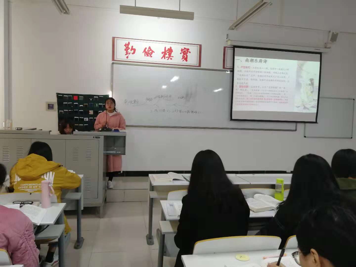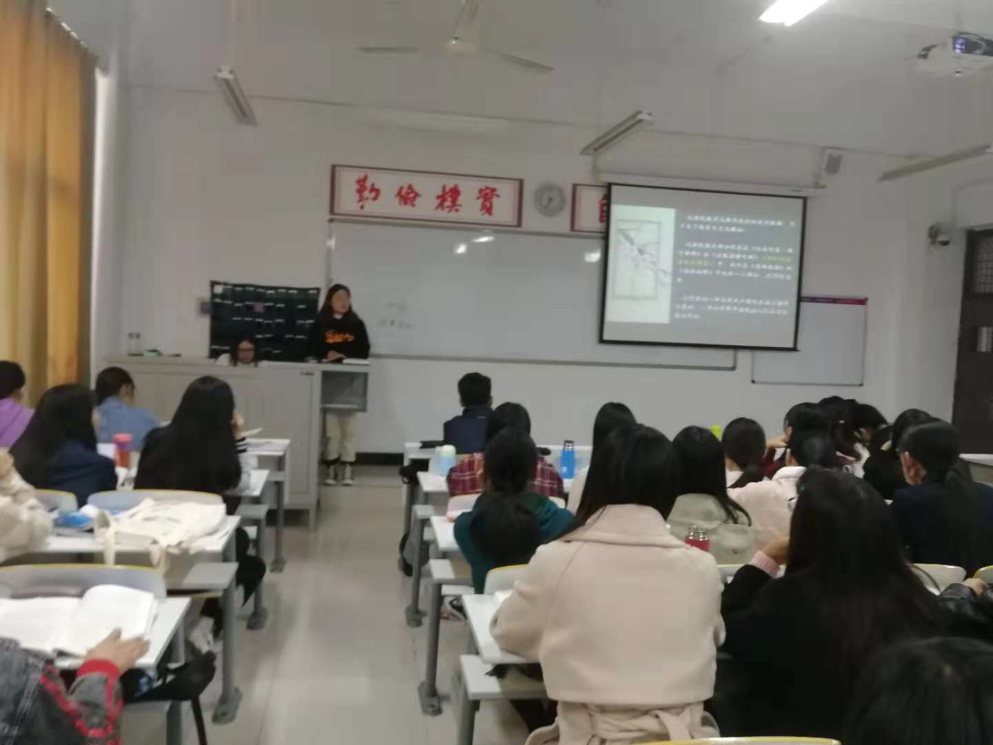 本学期第九周的课堂上,杨春艳老师又亲手导演了一次翻转课堂教学。杨老师安排了10个专题任务,2017级汉语言文学本科1班和2班各分为10组,每组认领一个专题任务。她指导员工分工合作,课下围绕各自小组的主题搜集资料,制作PPT,整理讲稿,每组选派一名代表在课堂上主讲,当一回真正的老师。各组代表讲完后,其他小组对课件制作与讲课方面的优点和不足进行了点评,最后老师做出总结。杨老师还要求课后各小组根据课堂上老师和员工提出的建议进一步修改PPT,再提交给老师。