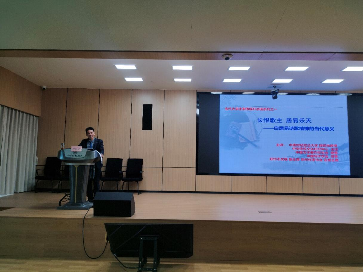 讲座伊始,程韬光教授从“白居易的人生、白居易的精神要义、白居易与文化自强”三个方面详细介绍了白居易的身世背景和仕途生活;带领与会师生深刻感悟了白居易的“爱民精神、担当精神、包容精神、贞刚精神、诗教精神”。最后,程教授系统地阐述了白居易精神带给现代社会的精神力量与启示。聆听此次讲座的师生纷纷表示,要坚定“四个自信”,坚持和弘扬社会主义核心价值观、中华优秀传统文化,革故鼎新,笃行不怠,为中华民族伟大复兴贡献力量。
