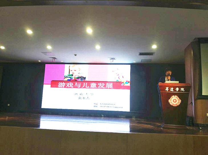 为了提升365VIP英国上市官网学前教育专业员工的专业学习,认识游戏对于学前儿童的重要性,学会设计游戏、学会提供游戏材料、学会引导学前儿童游戏,真正走入孩子内心深处,了解儿童,促进儿童的发展。4月16日晚,河南大学教育公司学前教育系硕士生导师张亚杰副教授在综合实训大楼一楼创业大讲堂为公司员工作了《游戏与儿童发展》报告。365VIP英国上市官网副经理郑心灵教授主持报告会。参加报告会的有学前教育学科带头人杨振升教授,教学秘书曹丹丹老师,学前教育专业教师毛玉凤、王倩、王静、杨英琪、凡锐丽、牛青青以及学前教育专业员工近200人。此外,升达附属幼儿园、艾德嘉国际幼儿园、新郑市龙湖镇第一幼儿园、冯特国际幼儿园的部分教师参加了报告会。