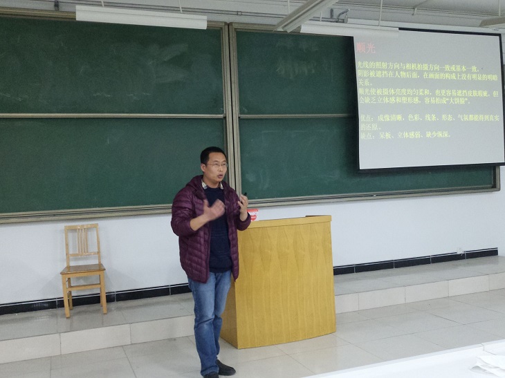 报告分两个主题:首先是摄影技巧与新闻选题和拍摄。刘栋杰老师通过几组照片的对比,用最简单的方式让大家对摄影技巧带来的作用有了基本的认识。然后,他从人像拍摄入手,与同学们热情的互动,并且介绍了四种最基本的肖像打光法,让同学们对光线的方向带来的作用有了一个基本的认识,并真正体验到摄影的乐趣。其次,刘老师概括了新闻摄影的含义和技巧、以及拍摄方法。他告诉同学们要不断提高自己的知识水平和认知能力,提高摄影观看和拍摄能力,提出新闻现场“早来晚走”原则和“多拍、多看”观点。