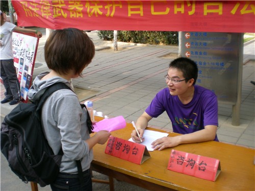 活动前期,咨询所的成员们进行了认真周密的准备,提前收集许多与日常生活密切相关的的法律知识印制成小卡片。宣传咨询活动期间,咨询所的成员们为大家分发法律知识卡片,使大家在感受风趣幽默语言的同时有效地学习了法律知识。还有很多同学来到服务台,就自己日常生活中遇到的法律问题或对法律的不解之处进行咨询,咨询所的成员们予以认真的解答。在处理这些具体事务过程中咨询所成员们不但在专业知识上得到进一步的巩固和提升,而且其自身的职业能力也受到了初步的锻炼。