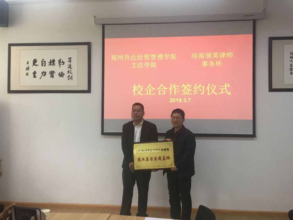 最后,段经理和郭红周律师签订了校企合作协议,段经理给郭律师颁发了校企合作牌匾并合影留念。段经理和郭律师表示今后双方会开展深入合作,进行优势互补,共同进步和发展,力争在法律行业留下浓墨重彩的一笔。(供稿人:刘建辉)