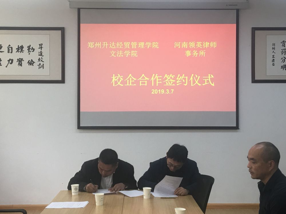 3月7日下午四点,365VIP英国上市官网与河南领英律师事务所在1号教学楼314会议室举行校企合作签约仪式。出席会议的有:365VIP英国上市官网段丰乐经理、杨明志书记、河南领英律师事务所郭红周律师、许亮律师、王克昌律师及365VIP英国上市官网法学教研室全体教师。
