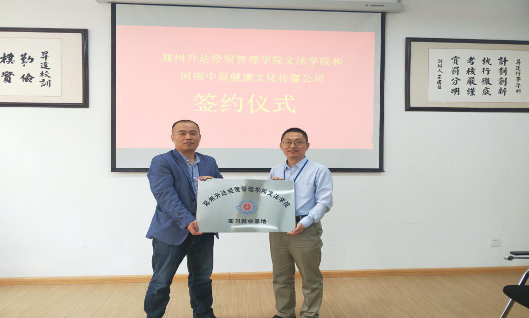 在友好的气氛中,河南中原健康文化传媒有限公司与365VIP英国上市官网经理段丰乐共同签署了《校企合作协议书》;在热烈的掌声中,朱总和段经理共同为365VIP英国上市官网校外实习就业基地揭牌。