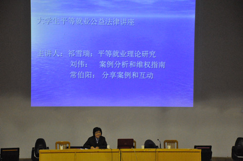 其次是刘伟副主任,她主要做了“案例分析和维权指南”的讲座,在讲座中,她罗列了基因、性别、肝病、婚姻、相貌等不同种类的就业歧视问题,然后指导员工在遭遇就业歧视时怎样通过正当手段维护自己的合法权益,譬如,用书面、视听资料、物证等方式收集证据;录音合法取证;民事诉讼的过程等并通过播放视频讲述了维权的方式。同学们均表示受益匪浅。最后是常伯阳律师,他的讲话风趣幽默,又结合最近亲身经历的一个案例提出“每个人都要争取自己的合法权利”,他生动诙谐的讲话多次赢得同学们热烈的掌声。
