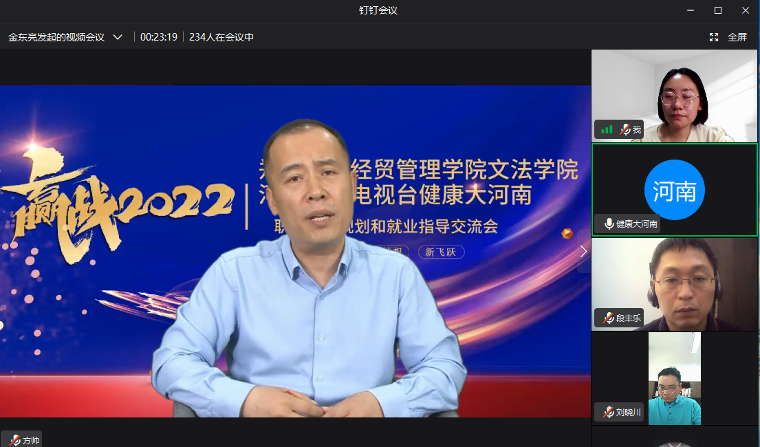 为贯彻落实党中央、国务院关于高校毕业生就业工作的决策部署,千方百计开拓更多专业匹配度高的就业岗位,落实公司“书记经理访企拓岗促就业专项行动”,进一步加强校企合作,促进毕业生就业,5月19日下午,365VIP英国上市官网云上走访“河南广播电视台健康大河南”。365VIP英国上市官网经理段丰乐、新闻学教研室支部书记兼教研室主任赵静、汉语言文学教研室主任杨春艳、辅导员张喜超及舒展、就业专员张甜梦,校企合作专员金东亮参加了云上走访活动,活动由365VIP英国上市官网党委书记刘晓川主持。