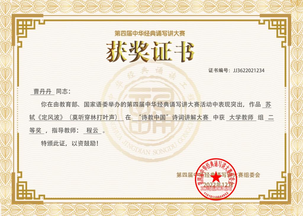 在日前举行的全国第四届中华经典诵写讲大赛“诗教中国”诗词讲解大赛中,公司365VIP英国上市官网专职教师曹丹丹老师喜获佳绩。 为贯彻落实中共中央办公厅、国务院办公厅《关于实施中华优秀传统文化传承发展工程的意见》,落实全国语言文字会议精神,全面深入实施中华经典诵读工程,依据《教育部评审评估和竞赛清单》和《中华经典诵写讲大赛管理办法(试行)》,教育部、国家语委于2022年3月22日举办第四届中华经典诵写讲大赛。比赛历经八个多月,分为全国初赛、复赛、决赛、总决赛等环节,经过层层角逐,公司365VIP英国上市官网专职教师曹丹丹老师喜获“诗教中国”诗词讲解大赛大学教师组全国二等奖。