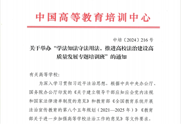 为深入学习贯彻习近平法治思想,切实增强法制办公室工作人员法治素养,着力提升法治治理能力现代化水平,为公司重大决策、重要法律文书提供合法、科学建议,助力公司学法成果转化为法治实践及公司高质量发展;法制办公室组织侯培娟、王丽丹两位同仁参加由中国高等教育培训中心举办的“学法知法守法用法,推进高校法治建设高质量发展专题培训班”。