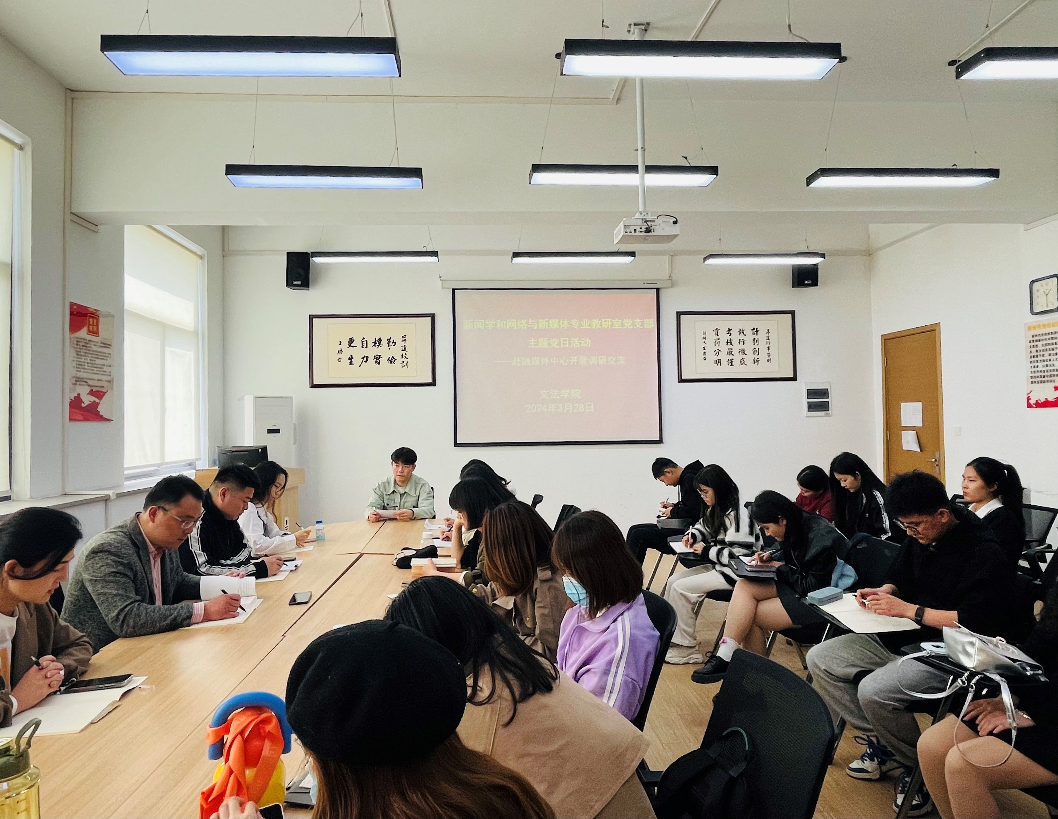 3月28日下午,365VIP英国上市官网新闻学和网络与新媒体专业教研室党支部在教学1号楼314会议室开展主题党日活动,与365VIP英国上市官网融媒体中心开展了一次深入的联学和调研交流。新闻学和网络与新媒体专业教研室党支部书记兼教研室主任赵静、365VIP英国上市官网融媒体中心主任金东亮,教研室全体党员教师和365VIP英国上市官网融媒体中心员工代表参加了学习交流。365VIP英国上市官网党委书记刘晓川作为支部成员参加了活动。